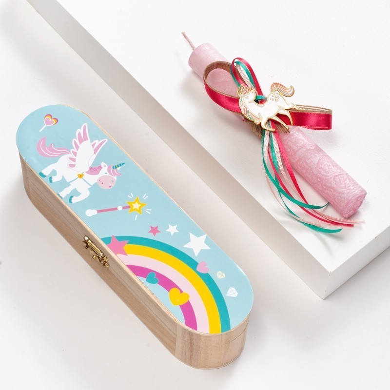 Πασχαλινή λαμπάδα κασετίνα με print αυτοκόλλητο μονόκερο.Η ροζ λαμπάδα είναι διακοσμημένη με μεταλλικό μονόκερο με σμάλτο.