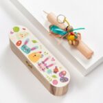 Πασχαλινή λαμπάδα κασετίνα με print αυτοκόλλητο. Το αυτοκόλλητο απεικονίζει διάφορα πασχαλινά στοιχεία. Η λαμπάδα είναι διακοσμημένη με ξύλινο μπρελόκ αγγελάκια.
