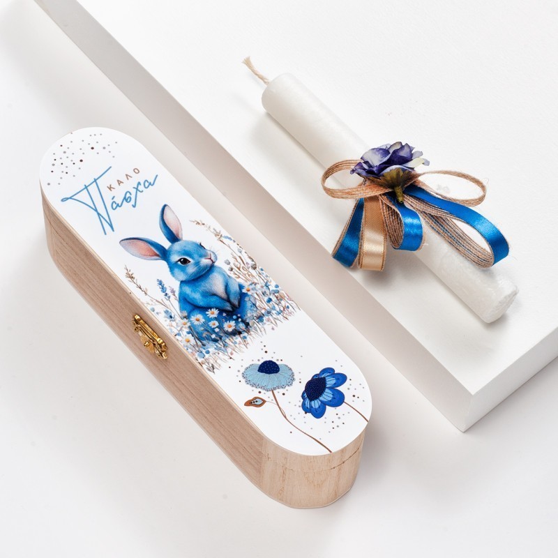 Πασχαλινή λαμπάδα κασετίνα με print αυτοκόλλητο μπλε λαγό. Η παράσταση απεικονίζει ένα μπλε λαγό με λουλούδια και η λευκή λαμπάδα είναι διακοσμημένη με μπλε υφασμάτινο λουλούδι.