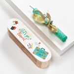 Πασχαλινή λαμπάδα κασετίνα με print αυτοκόλλητο travel .Η βεραμάν λαμπάδα είναι διακοσμημένη με πολυεστερικό μπρελόκ υδρόγειος.