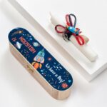 Πασχαλινή λαμπάδα κασετίνα με print αυτοκόλλητο που απεικονίζει τον πύραυλο στο διάστημα. Η λευκή λαμπάδα είναι διακοσμημένη με πολυεστερικό μπρελόκ πύραυλο.