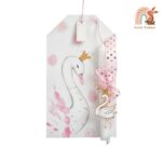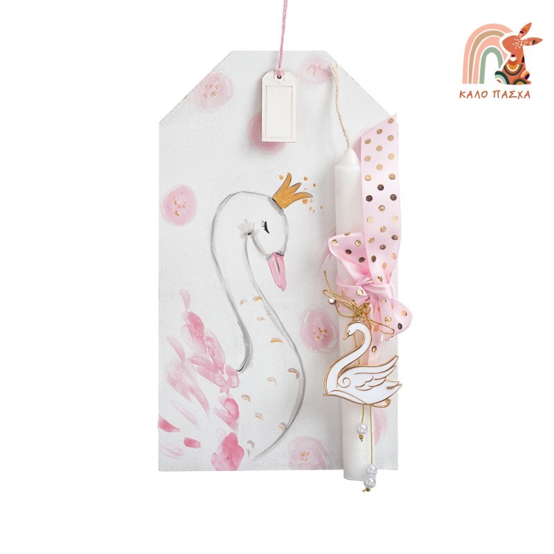 Πασχαλινή λαμπάδα με θέμα κύκνος. Το πασχαλινό δωράκι περιλαμβάνει: 1) την ξύλινη κρεμαστή ετικέτα ζωγραφισμένη με κύκνο με κορώνα 2) τη λαμπάδα η οποία είναι διακοσμημένη με υφασμάτινη ροζ κορδέλα με πουά χρυσό και μεταλλικό μοτίφ κύκνος