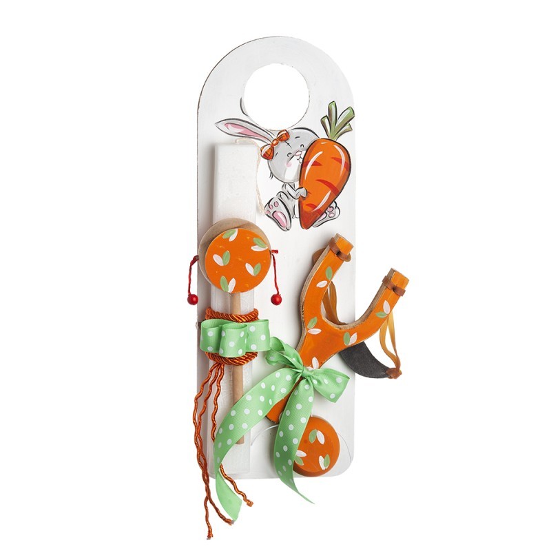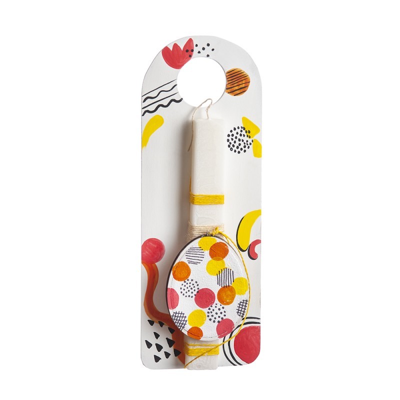 Πασχαλινή λαμπάδα με αυγουλάκι . Το πασχαλινό δωράκι περιλαμβάνει: 1) την ξύλινη ετικέτα ζωγραφισμένη 2) ζωγραφιστό αυγουλάκι σε πορτοκαλί και κίτρινες αποχρώσεις.