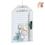 1) τη ξύλινη κρεμαστή ετικέτα εκτυπωμένη σε βεραμάν ριγέ χρώμα και με λαγουδάκι