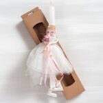 Πασχαλινή λαμπάδα διακοσμημένη με υφασμάτινη κούκλα σε λευκές αποχρώσεις και τούλινη φούστα. Η λαμπάδα είναι τοποθετημένη σε χάρτινο natural κουτί με παράθυρο.
