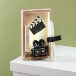 Πασχαλινή λαμπάδα σε καδράκι με led φωτισμό και θέμα τον κινηματογράφο. Το καδράκι περιλαμβάνει: α) πολυεστερική κινηματογραφική μηχανή- κουμπαρά β) λευκή λαμπάδα στολισμένη με μαύρο φιόγκο.