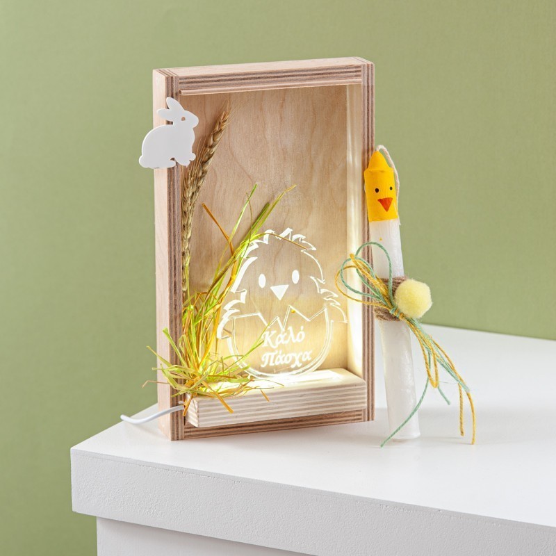 Πασχαλινή λαμπάδα σε καδράκι με led φωτισμό. Η λαμπάδα περιλαμβάνει α) με λαγουδάκι από διάφανο plexiglass β) ζωγραφισμένη λαμπάδα σε κόκκινη απόχρωση με πουά λευκό και διακοσμημένη με πασχαλίτσες.