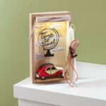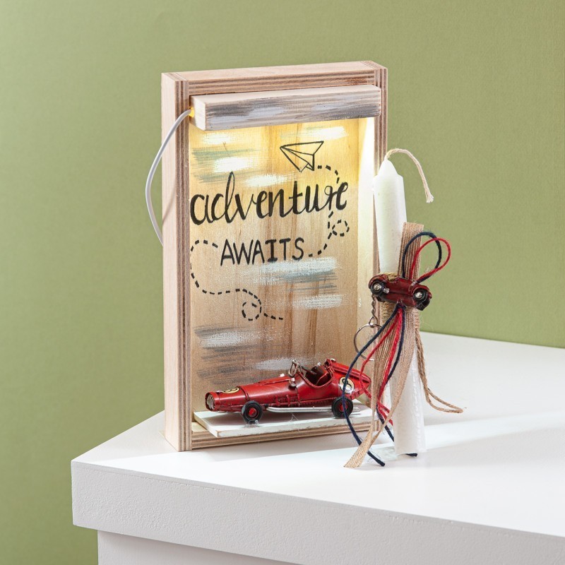 Πασχαλινή λαμπάδα σε καδράκι με led φωτισμό και θέμα το αυτοκινητάκι. Το καδράκι περιλαμβάνει μεταλλικό αυτοκινητάκι ντεσεβό με logo “Τime to travel” και στολισμένη λευκή λαμπάδα με μπρελόκ βενζινομηχανή.