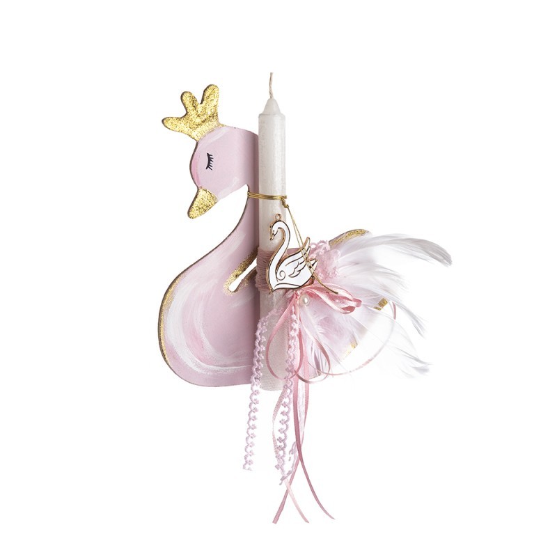 3) τη λαμπάδα η οποία είναι ζωγραφισμένη με πολύχρωμα πουά και διακοσμημένη με πολύχρωμα pom pom.