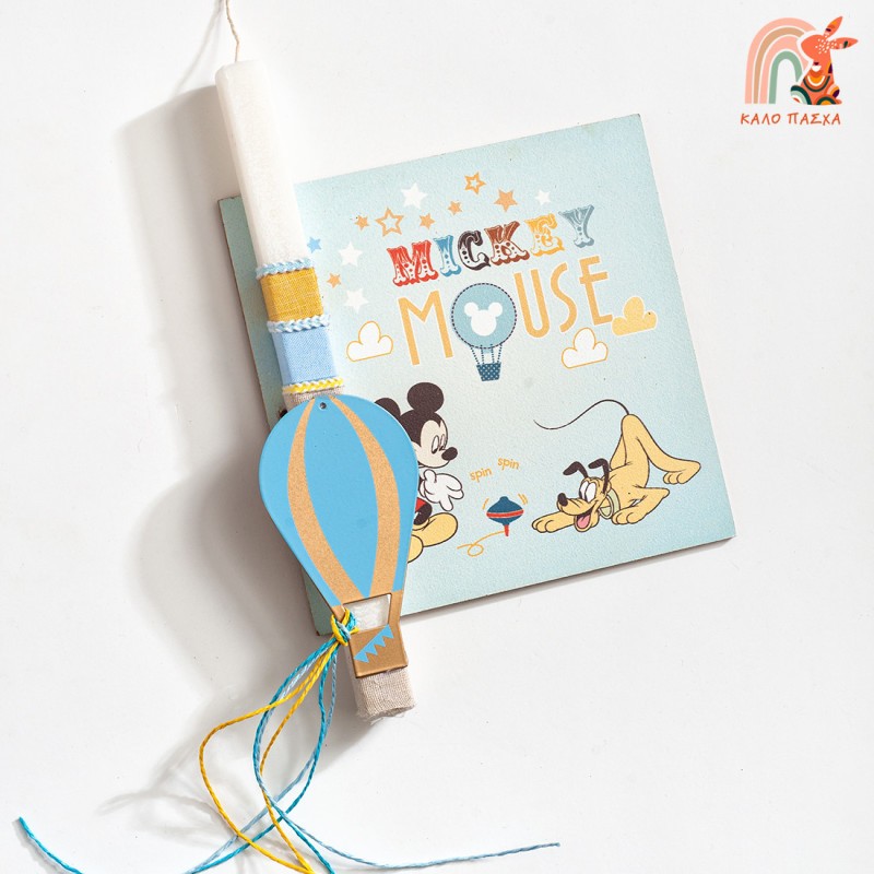Πασχαλινή λαμπάδα με θέμα τον Mickey.Η λαμπάδα είναι διακοσμημένη με ξύλινη παράσταση Mickey Carnival σε κίτρινες-κόκκινες αποχρώσεις.