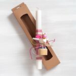 Πασχαλινή λαμπάδα στολισμένη με ροζ λινάτσα και διακοσμημένη με ξύλινη πιεζόμενη μαριονέτα μονόκερος.Η λαμπάδα είναι τοποθετημένη σε χάρτινο natural κουτί με παράθυρο.