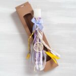 Πασχαλινή λαμπάδα στολισμένη με φλοραλ λιλά ύφασμα και διακοσμημένη με μπρελόκ ονειροπαγίδα.Η λαμπάδα είναι τοποθετημένη σε χάρτινο natural κουτί με παράθυρο.