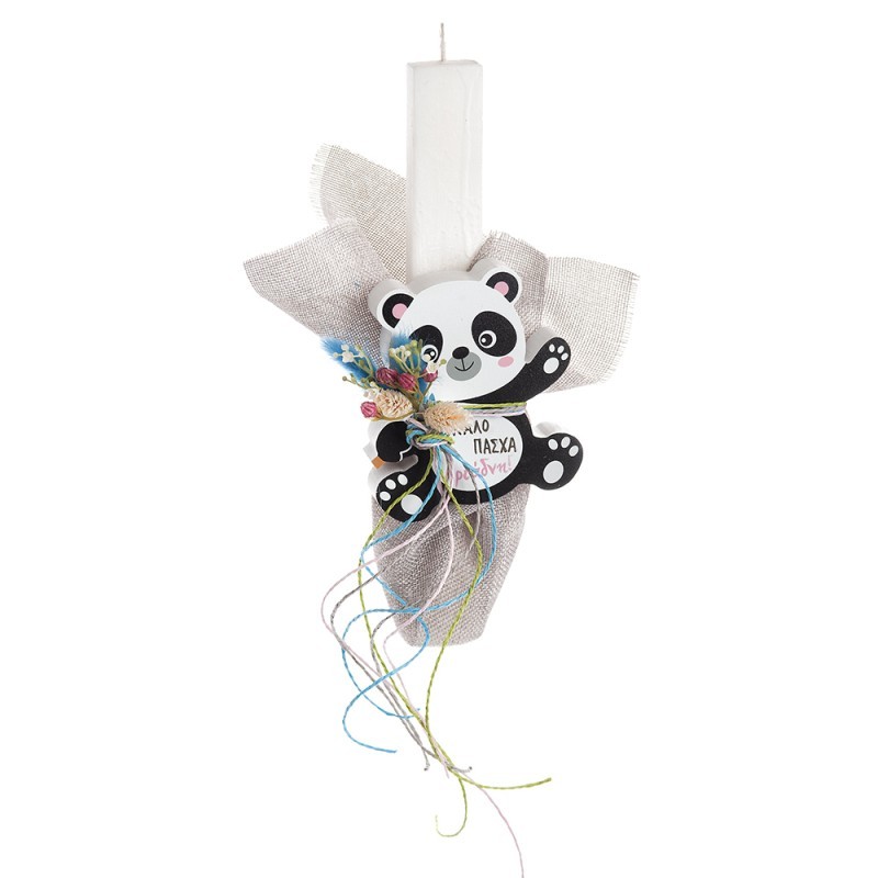 Πασχαλινή λαμπάδα με θέμα το Panda .Το πασχαλινό δωράκι περιλαμβάνει λαμπάδα διακοσμημένη με ξύλινο διακοσμητικό panda και λουλούδια .