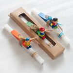 Πασχαλινή λαμπάδα διακοσμημένη με ξύλινο stop πόρτας πειρατής. Η λαμπάδα είναι τοποθετημένη σε χάρτινο natural κουτί με παράθυρο.