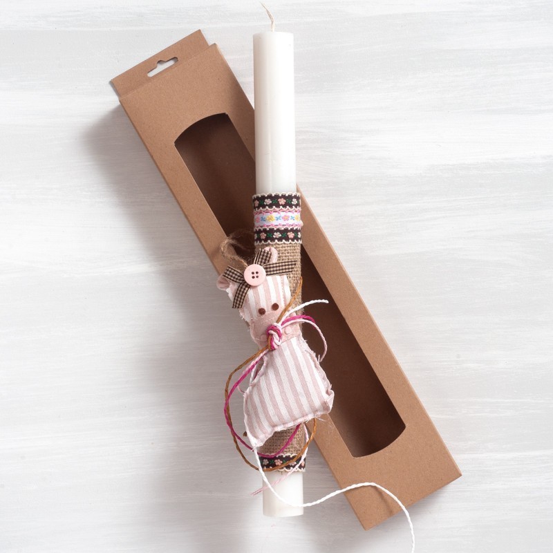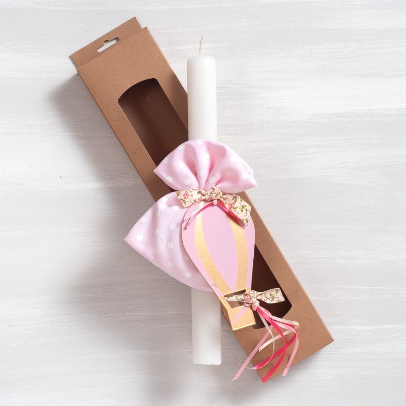 Πασχαλινή λαμπάδα στολισμένη με ροζ πουά πουγκί και διακοσμημένη με μεταλλικό χρυσό- ροζ αερόστατο .Η λαμπάδα είναι τοποθετημένη σε χάρτινο natural κουτί με παράθυρο.