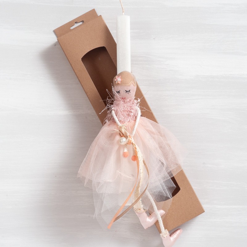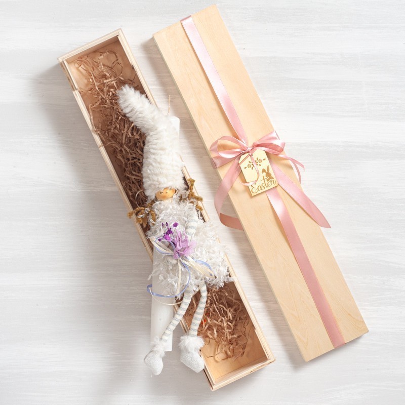 Πασχαλινή λαμπάδα με κουκλιτσα σε ξύλινο natural κουτί συσκευασίας. Η λαμπάδα είναι διακοσμημένη σε ρομαντικό ύφος και περιλαμβάνει υφασμάτινη κούκλα με πούπουλα σε λευκό χρώμα.