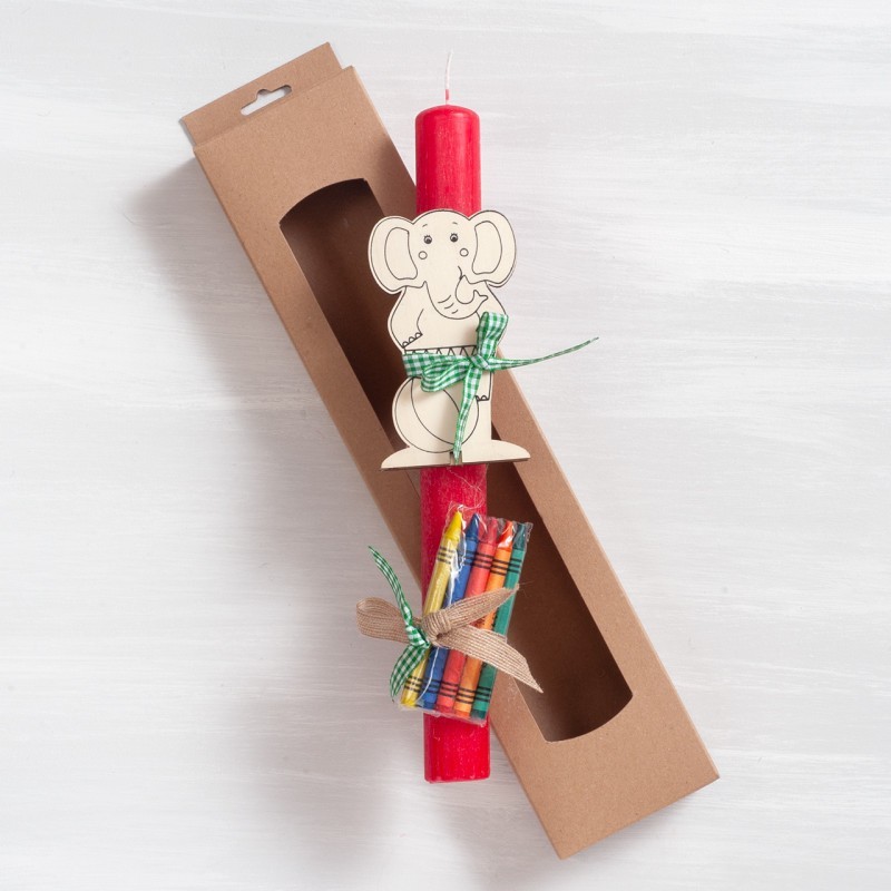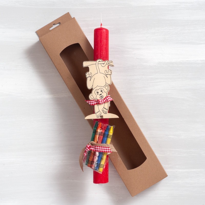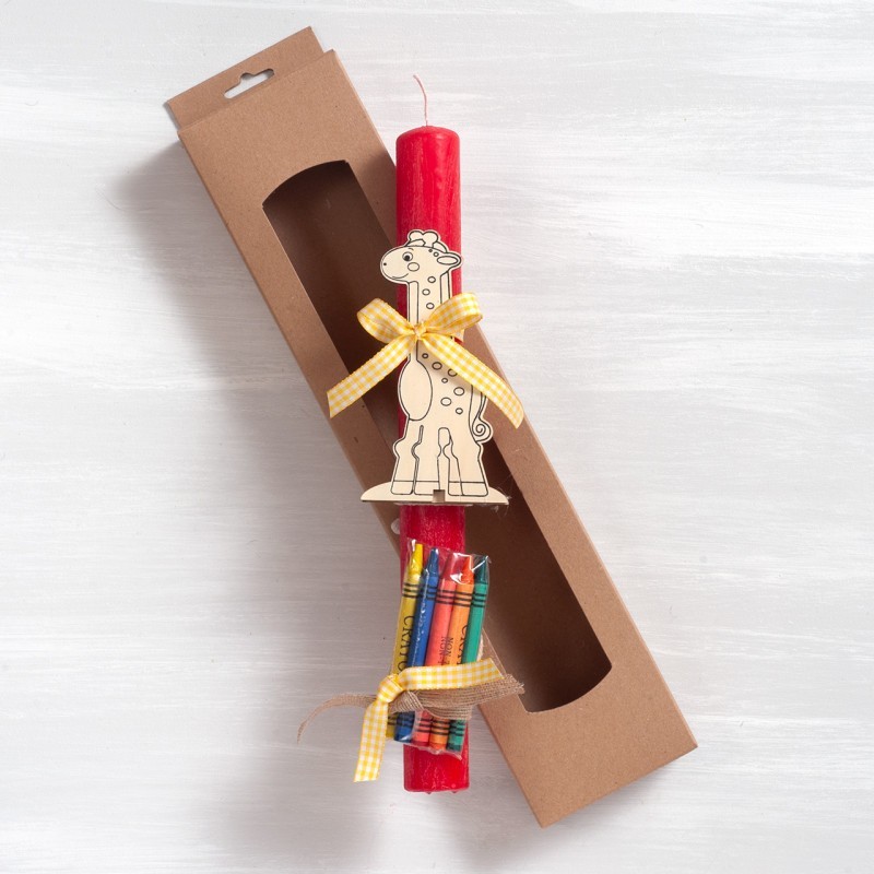 Πασχαλινή λαμπάδα διακοσμημένη με ξύλινο σετ ζωγραφικής με ζωάκια και πέντε κηρομπογιές.Η λαμπάδα είναι τοποθετημένη σε χάρτινο natural κουτί με παράθυρο.