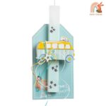 Πασχαλινή λαμπάδα με θέμα Van .Η λαμπάδα είναι ζωγραφισμένη με αστεράκια και στολισμένη με ξύλινο ζωγραφιστό Van σε βεραμάν- κίτρινες αποχρώσεις. Το δώρο ολοκληρώνει η ξύλινη print travel ετικέτα.