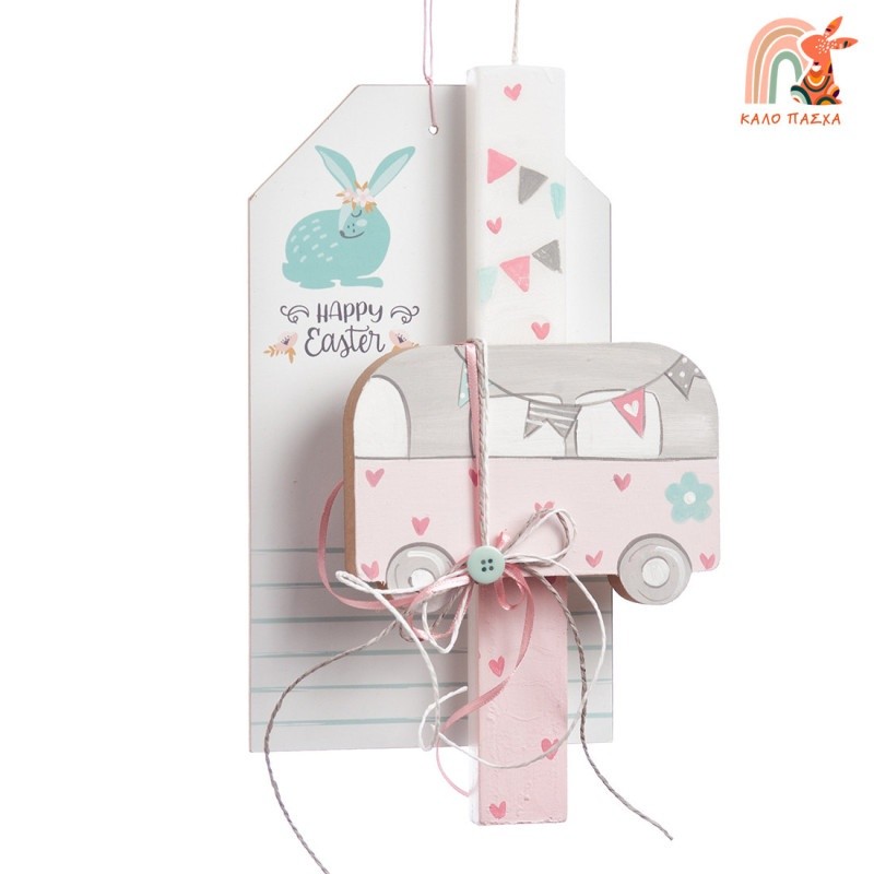 Πασχαλινή λαμπάδα με θέμα Van .Η λαμπάδα είναι ζωγραφισμένη σε ροζ αποχρώσεις και στολισμένη με ξύλινο ζωγραφιστό Van.Το δώρο ολοκληρώνει η ξύλινη print ετικέτα.