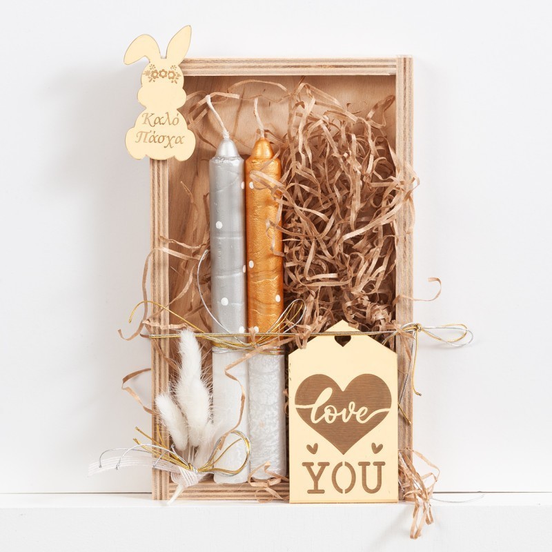 Πασχαλινό καδράκι για ζευγάρια. Το δωράκι περιλαμβάνει : α)δύο λαμπάδες ζωγραφισμένες σε ασημί – χρυσές αποχρώσεις β) plexiglass χρυσή ετικέτα με την φράση I love you.