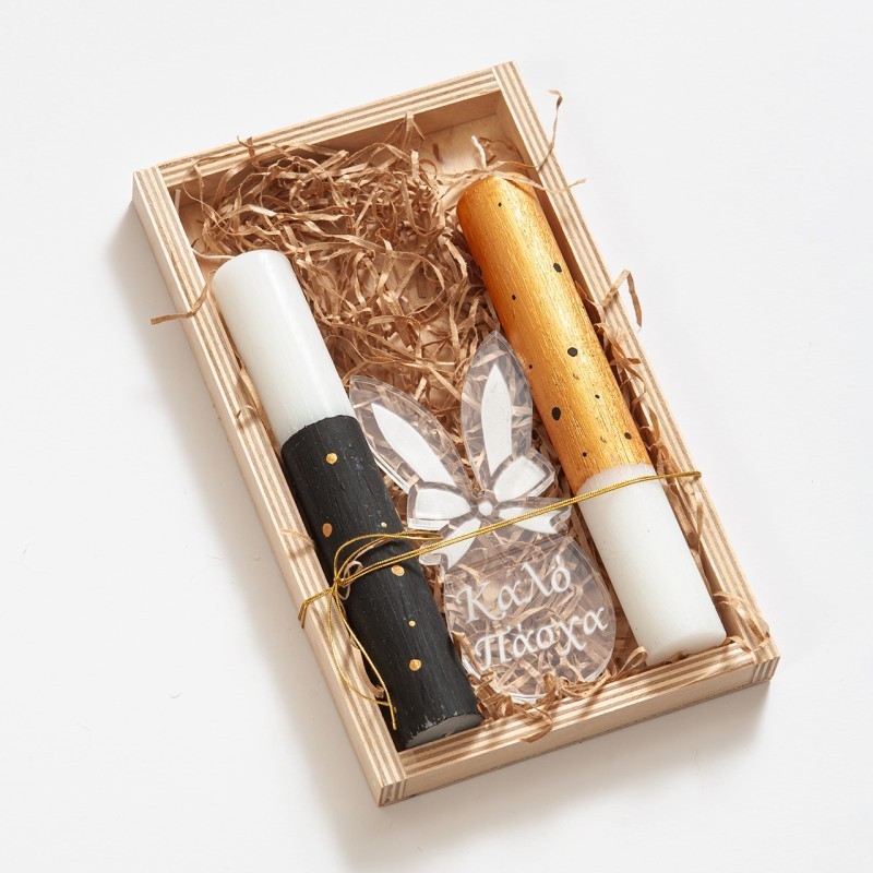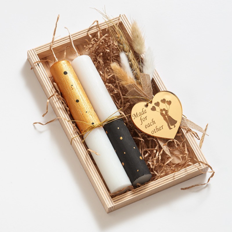 Πασχαλινό καδράκι για ζευγάρια “Μade for each other”. Το δωράκι περιλαμβάνει: α)δύο λαμπάδες ζωγραφισμένες με χρυσές και μαύρες λεπτομέρειες β) μπουκέτο από αποξηραμένα λουλούδια σε εκρού αποχρώσεις γ) χρυσή plexi ετικέτα σε σχήμα καρδιάς.