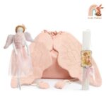 Πασχαλινό σετ δώρου. Περιλαμβάνει: 1) το υφασμάτινο backpack με σχέδιο φτερά αγγέλου σε dust pink χρώμα με χρυσές λεπτομέρειες 2) τη λαμπάδα διακοσμημένη με μαγνητάκι με ρομαντική παράσταση αγγελάκια 3) υφασμάτινη κούκλα-αγγελάκι σε ροζ απόχρωση