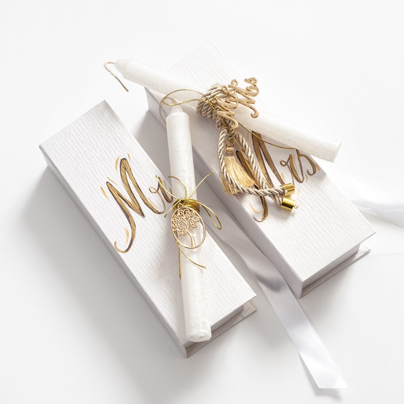 Πασχαλινή λαμπάδα με μότο “Μ’ αγαπάς;-Σ’ αγαπάω” . Το πασχαλινό δωράκι για ζευγάρια περιλαμβάνει: 1) δύο χάρτινα ζωγραφιστά κουτάκια . 2) δύο λαμπάδες διακοσμημένες με μοτιφ χρυσό στεφανάκι και μοτιφ χρυσό δέντρο της ζωής, μία για ΕΚΕΙΝΗ και μία για ΕΚΕΙΝΟΝ.