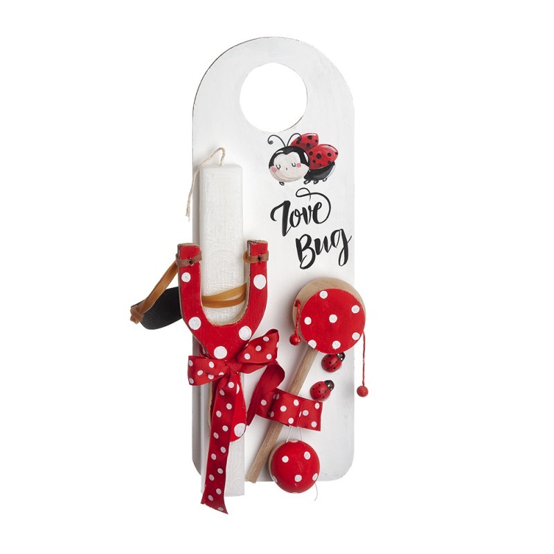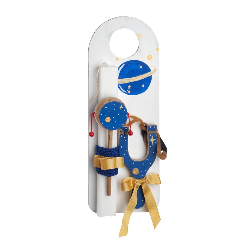 Πασχαλινή λαμπάδα με θέμα κουνελάκι . Το πασχαλινό δωράκι περιλαμβάνει: 1) το ξύλινο διακοσμητικό πόρτας ζωγραφισμένο με κουνελάκι 2) ξύλινη σφεντόνα και γιο γιο ζωγραφιστά 3) τη λαμπάδα διακοσμημένη με ξύλινο ζωγραφιστό τυμπανάκι.
