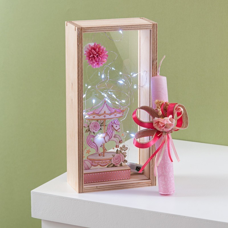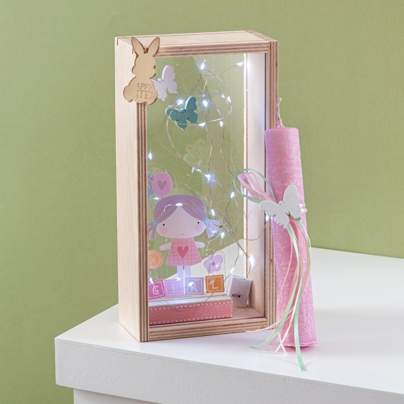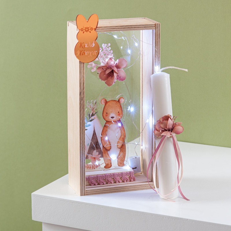 Πασχαλινό σετ δώρου σε ξύλινο natural κουτί με φωτάκια led.Το δωράκι έχει θέμα το αρκουδάκι με σκηνή σε boho style print σε διάφανο plexiglass συνοδεύεται από στολισμένη λαμπάδα με αντίστοιχα στοιχεία.
