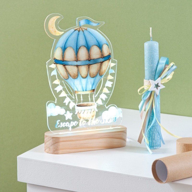 Πασχαλινό σετ δώρου με ξύλινη βάση και led φωτισμό. Το θέμα είναι το ουράνιο τόξο απόχρωση print σε διάφανο plexiglass.To σετ περιλαμβάνει χάρτινο οικολογικό πάπυρο για την λαμπάδα.