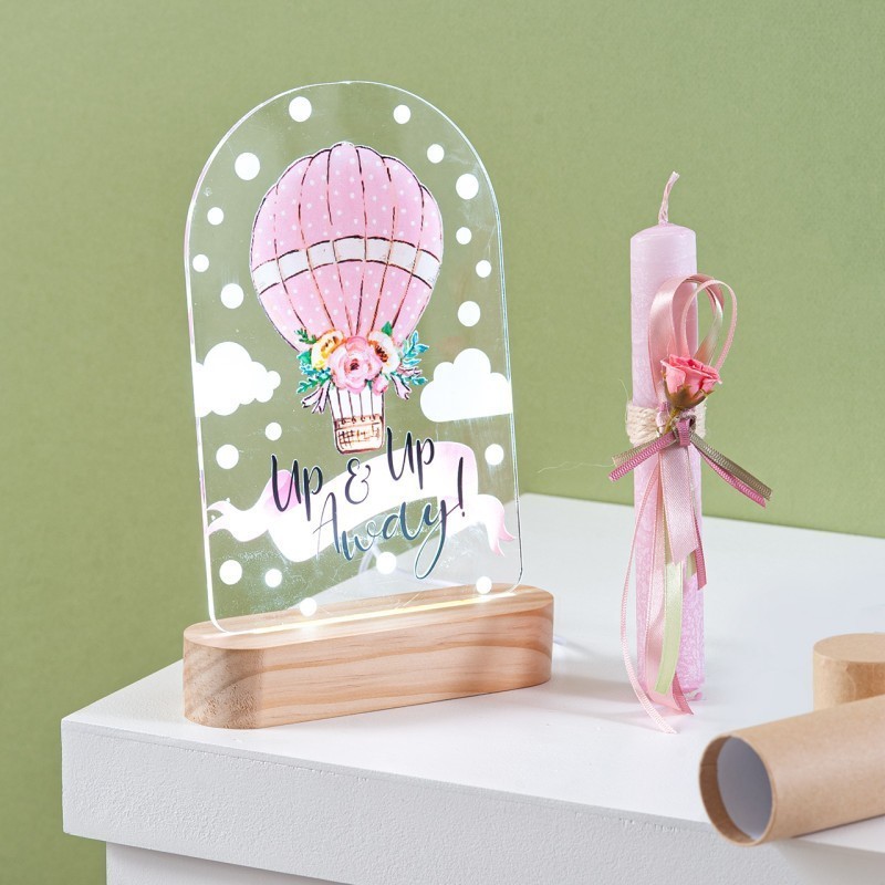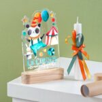 Πασχαλινό σετ δώρου με ξύλινη βάση και led φωτισμό. Το θέμα είναι τσίρκο print σε διάφανο plexiglass.To σετ περιλαμβάνει χάρτινο οικολογικό πάπυρο για την λαμπάδα.