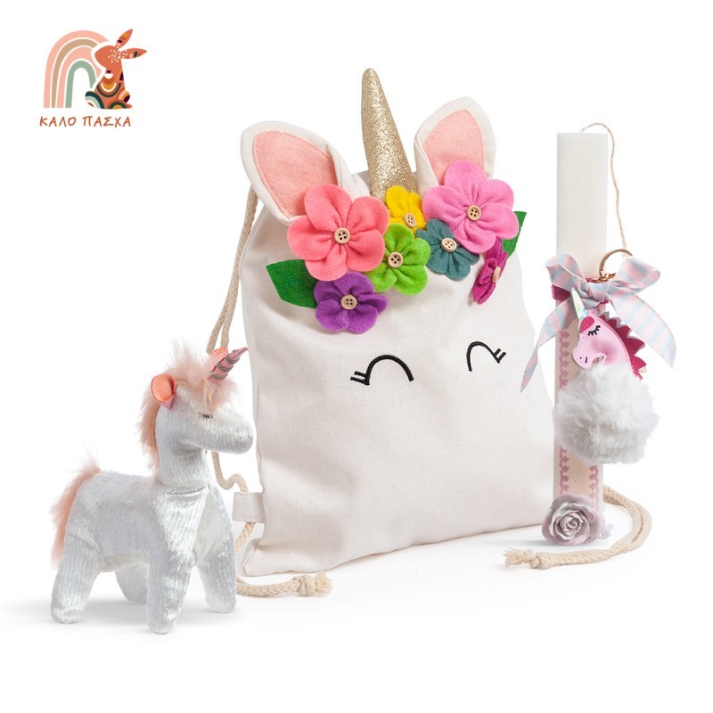 Πασχαλινό σετ δώρου. Περιλαμβάνει: 1) το υφασμάτινο backpack με σχέδιο μονόκερος 2) τη λαμπάδα διακοσμημένη με pvc μπρελόκ μονόκερο και διακοσμητικό polyester τριαντάφυλλο 3) λούτρινο κουκλάκι μονόκερο