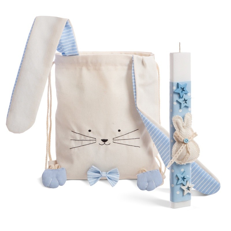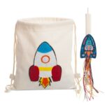 Πασχαλινό σετ δώρου. Περιλαμβάνει: 1) το υφασμάτινο backpack με σχέδιο τον πύραυλο 2) τη λαμπάδα διακοσμημένη με ξύλινη παράσταση που απεικονίζει ένα πύραυλο να απογειώνεται στο διάστημα.