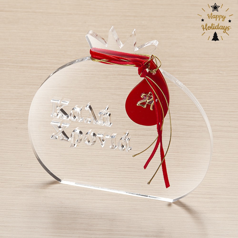 Plexiglass διακοσμητικό στρογγυλό ρόδι σε διάφανο χρώμα. Στο επιτραπέζιο ρόδι είναι χαραγμένη η ευχή “Καλή Χρονιά” και είναι στολισμένο με μεταλλικό μοτίφ διαμαντάκι, χρυσά κορδόνια και βελούδινη κορδέλα σε σάπιο μήλο.