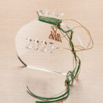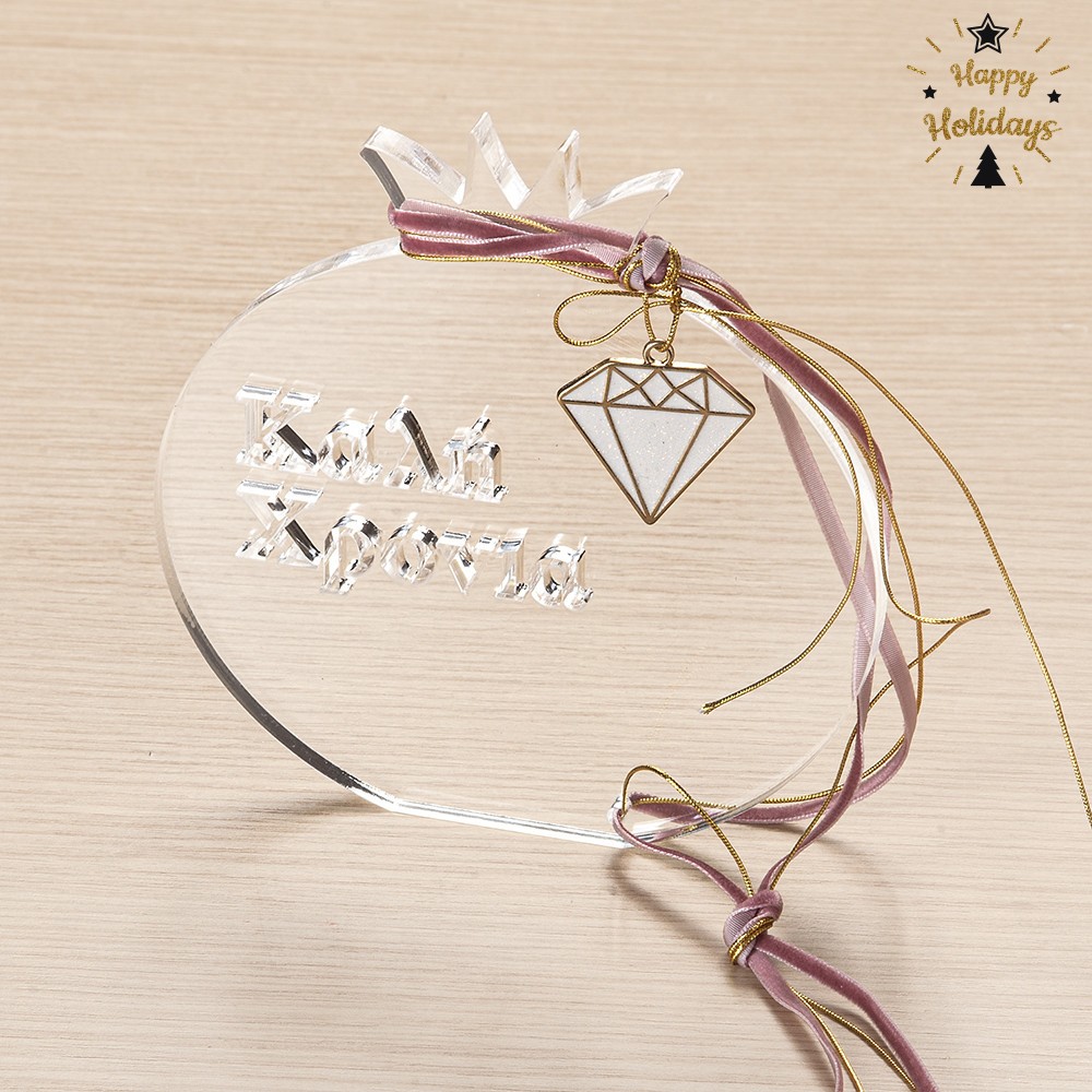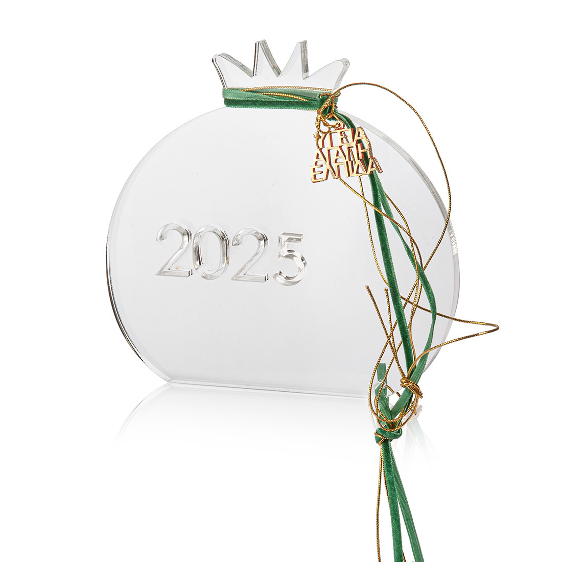 Plexiglass διακοσμητικό οβάλ ρόδι σε διάφανο χρώμα. Στο επιτραπέζιο ρόδι είναι χαραγμένο το “2026” και είναι στολισμένο με μεταλλικό μοτίφ, χρυσά κορδόνια και κορδέλα βελούδινη σε πράσινη απόχρωση.