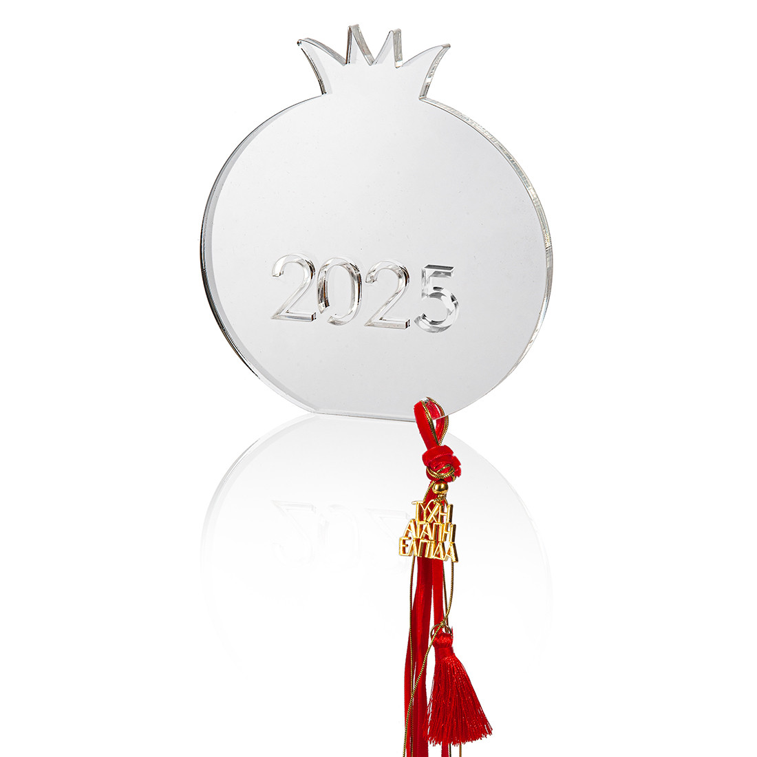 Plexiglass διακοσμητικό στρογγυλό ρόδι σε διάφανο χρώμα. Στο επιτραπέζιο ρόδι είναι χαραγμένο το “2026”.Το κάτω μέρος είναι διακοσμημένο με μεταλλικό μοτίφ, χρυσά κορδόνια, κόκκινη φούντα και βελούδινη κορδέλα σε κόκκινη απόχρωση.