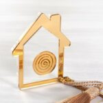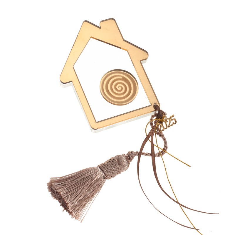 Plexiglass διακοσμητικό σπιτάκι. Η βάση του είναι διάφανη και το επάνω μέρος χρυσός καθρέπτης σπείρα. Το επιτραπέζιο σπιτάκι είναι διακοσμημένο με μεταλλικό μοτίφ και μπεζ φούντα.