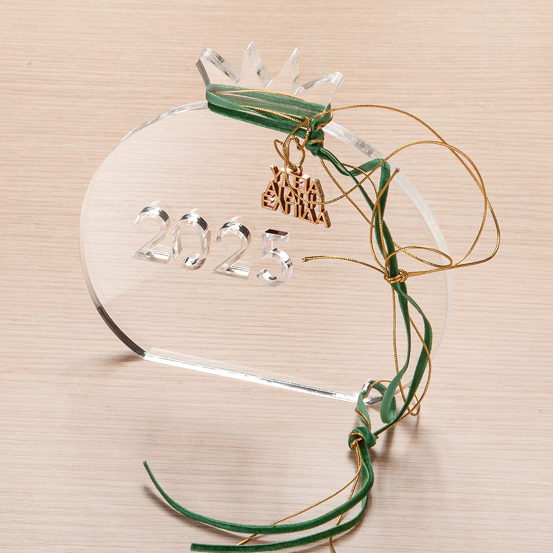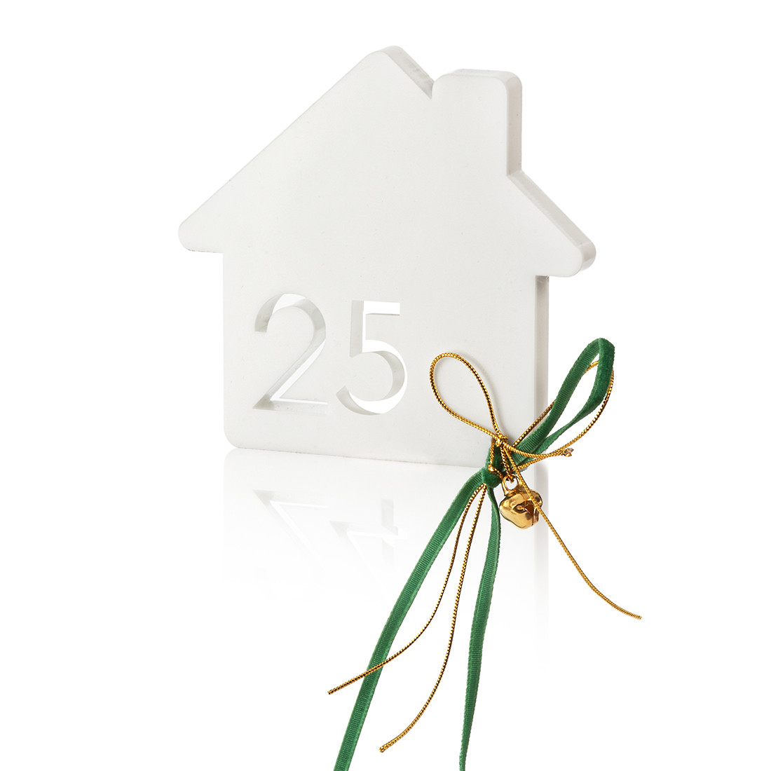Plexiglass διακοσμητικό σπιτάκι σε λευκό χρώμα. Στο εσωτερικό είναι χαραγμένο το ”26″.To επιτραπέζιο σπιτάκι είναι στολισμένο με χρυσά κορδόνια και βελούδινη κορδέλα σε πράσινη απόχρωση.