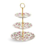 Πορσελάνινη επιτραπέζια τουρτιέρα τριών επιπέδων σε λευκό χρώμα με τριαντάφυλλα φούξια. Ιδανική παρουσίαση στις εκδηλώσεις σας για τοποθέτηση γλυκών και αλμυρών λιχουδιών