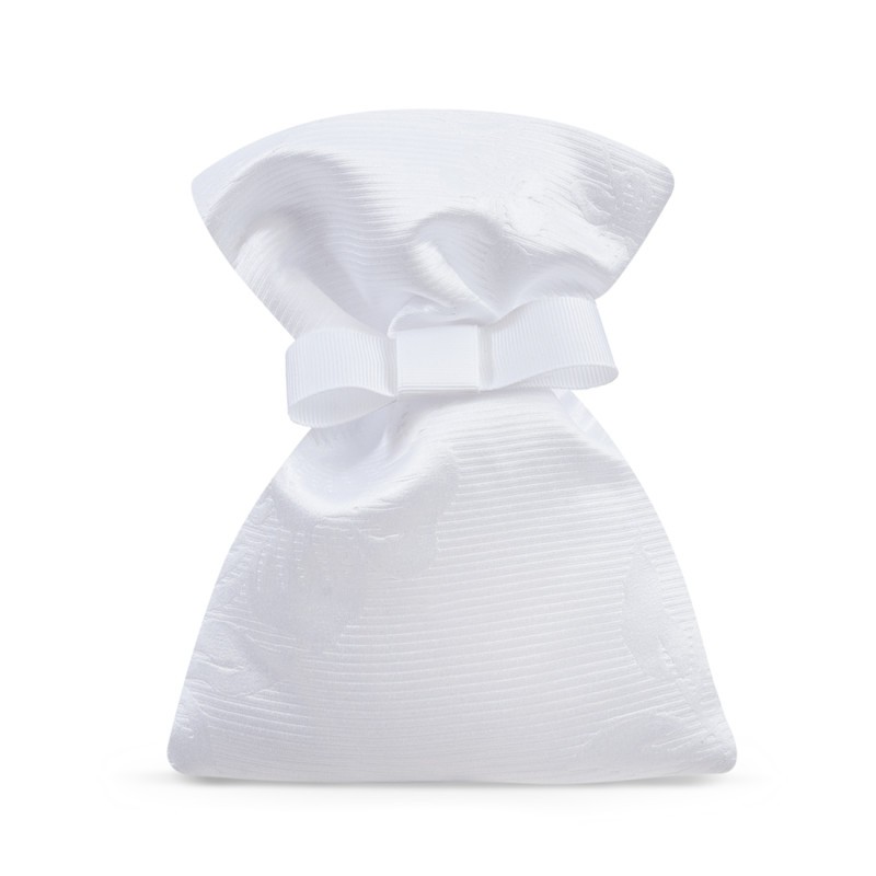 Πουγκί από λευκό τούλι βουάλ με κέντημα & στρας. Το πουγκί έχει σατέν επένδυση σε λευκό χρώμα.