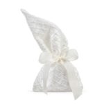 Πουγκί με λοξό γάζωμα στο λαιμό. Το υλικό είναι τούλι βουάλ σε εκρού χρώμα με κέντημα & στρας. Το πουγκί έχει σατέν επένδυση σε εκρού χρώμα.