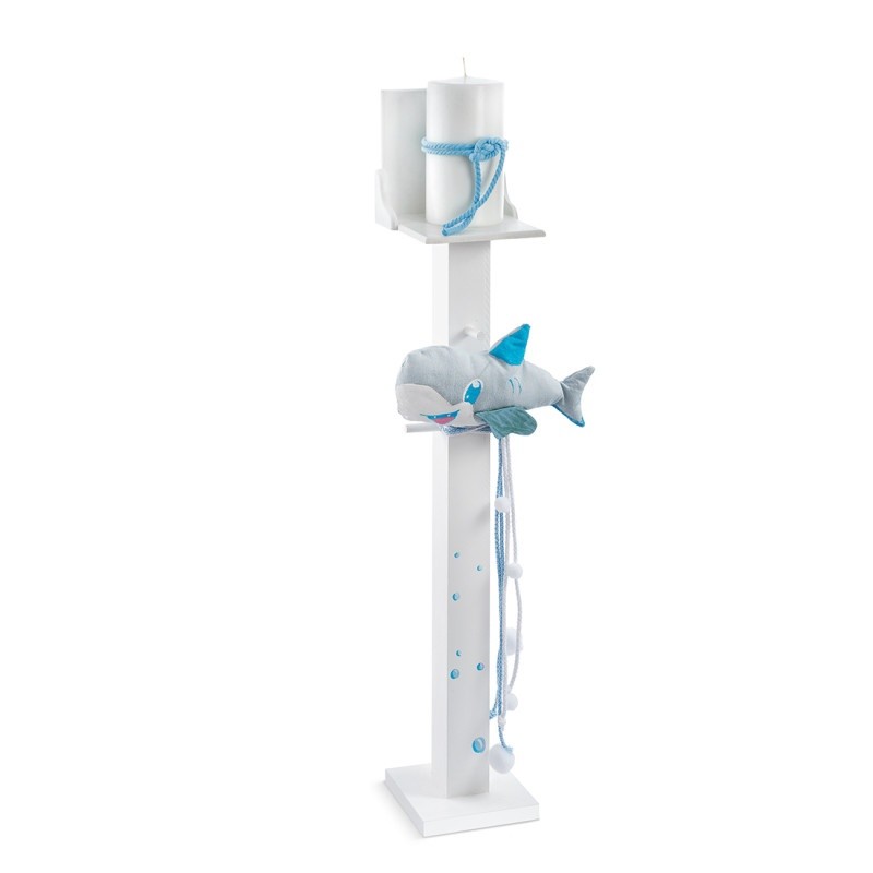 Ζωγραφιστή υφασμάτινη τσάντα με 3 κεριά, σαπούνι και μπουκάλι λαδιού στολισμένα με βαμβακερό σιέλ κορδόνι και poms poms. H τσάντα είναι ζωγραφιστή στο μπροστινό κομμάτι με το μικρό καρχαριάκι-Baby Shark.