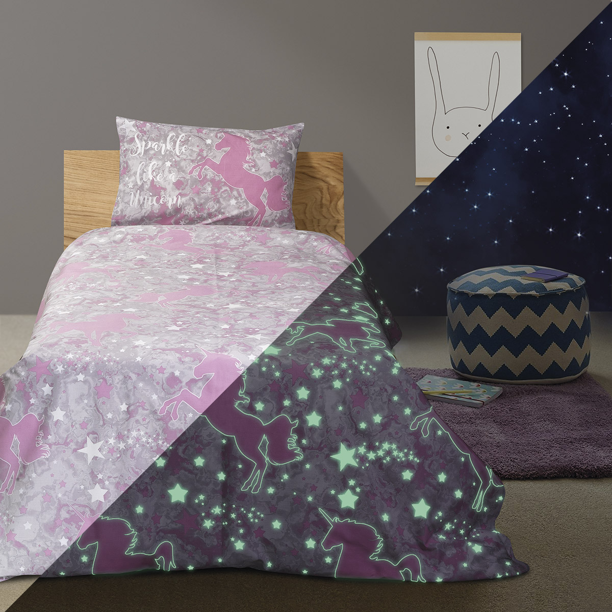 Σετ σεντόνια μονά φωσφοριζέ Centaur . Το σετ περιλαμβάνει 1 τεμάχιο σε διάσταση 170×240 και 1 τεμάχιο μαξιλαροθήκη σε διάσταση 50×70+5 .