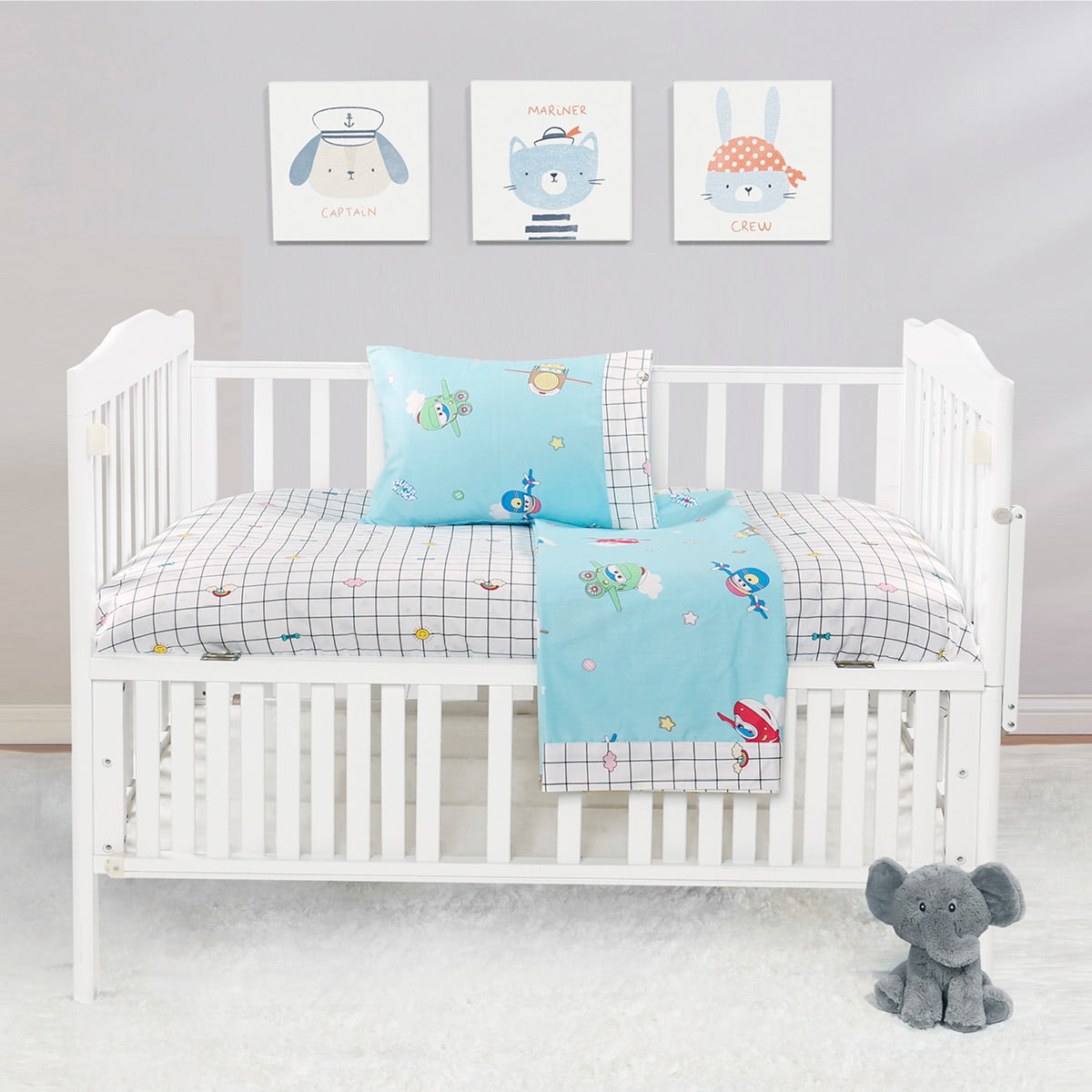 Το σετ περιλαμβάνει 1 τεμάχιο πανωσέντονο σε διάσταση 120×160, 1 τεμάχιο κατωσέντονο με λάστιχο σε διάσταση 70×140+15 και 1 τεμάχιο μαξιλαροθήκη σε διάσταση 35×45.