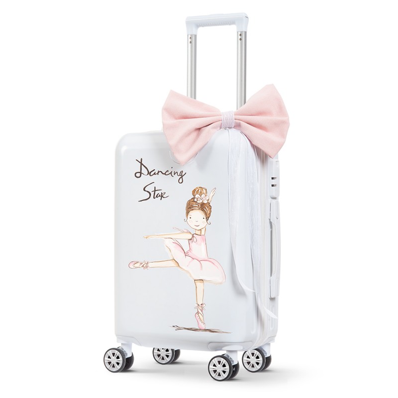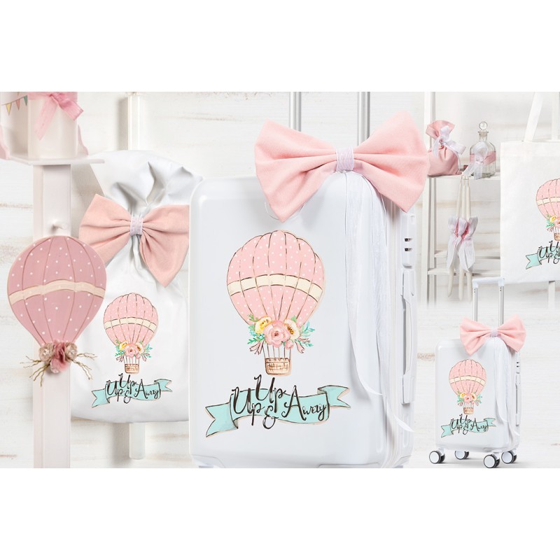 1)Ζωγραφιστή βαλίτσα trolley σε άσπρο γυαλιστερό χρώμα με θέμα ένα πουά ροζ αερόστατο, στολισμένη με υφασμάτινο ροζ φιόγκο.