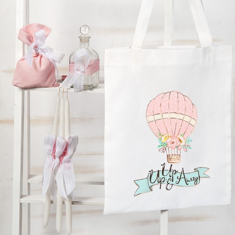 3)Ζωγραφιστή υφασμάτινη τσάντα με το αερόστατο με 3 κεριά,σαπούνι και μπουκάλι λαδιού στολισμένα σε ροζ αποχρώσεις.