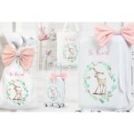1)Ζωγραφιστή βαλίτσα trolley σε άσπρο γυαλιστερό χρώμα με θέμα το μικρό ελαφάκι και στολισμένη με υφασμάτινο ροζ φιόγκο.