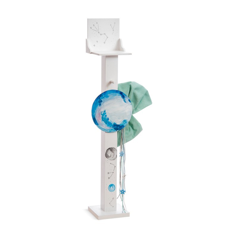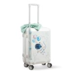 Ζωγραφιστή βαλίτσα trolley για βαπτιστικά σε άσπρο γυαλιστερό χρώμα. Το θέμα της βάπτισης είναι ο αστροναύτης που κρατάει τους πλανήτες σε σιέλ και μπλε navy χρώματα. Στο πάνω μέρος της βαλίτσας ο υφασμάτινος βεραμάν φιόγκος με τα κορδόνια και τα ξύλινα αστεράκια, προσθέτουν μια μοντέρνα διακόσμηση.