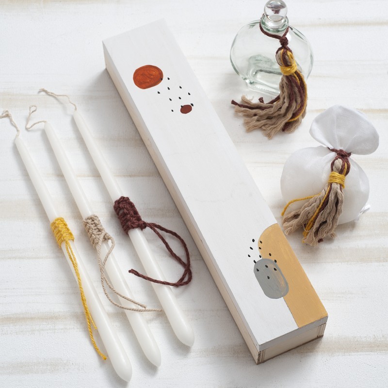 Ζωγραφιστή βαλίτσα trolley για βαπτιστικά σε άσπρο γυαλιστερό χρώμα. Το θέμα της ζωγραφικής είναι Μοντέρνα γεωμετρία. Τα σχέδια είναι ζωγραφισμένα σε γήινες αποχρώσεις με αφαιρετικά-αφηρημένα σχέδια.