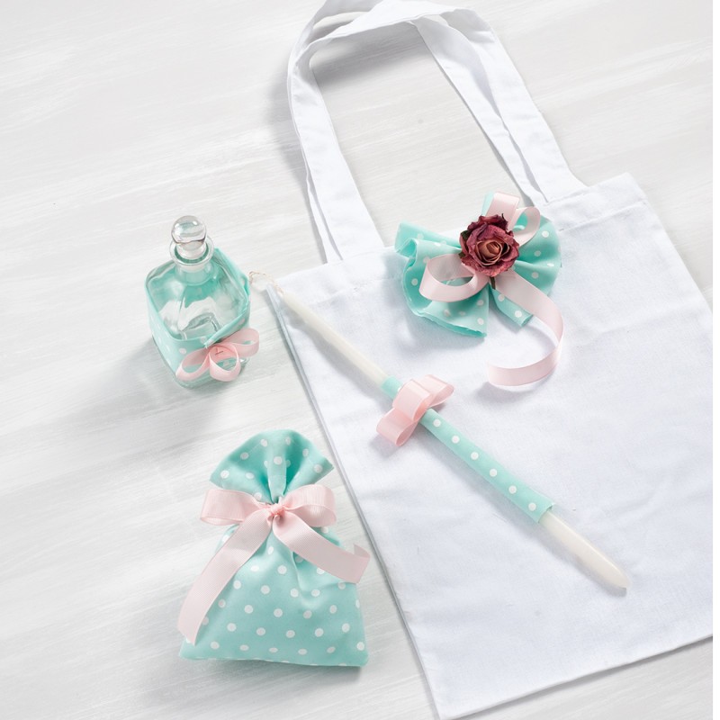 Υφασμάτινη τσάντα με 3 κεριά, σαπούνι και μπουκάλι λαδιού στολισμένα σε ροζ floral αποχρώσεις.